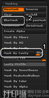 5、接下来,进入Masking子菜单,激活Mask By Cavity选项,将遮罩所有的空洞,然后按Blur Mask按钮模糊遮罩边缘。