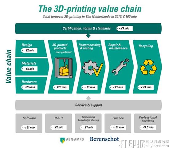 最近的一份报告显示,荷兰3D打印行业在2017年预计将达到1.2亿欧元(约9亿人民币)。这份报告由荷兰银行ABN AMRO和咨询公司Berenschot联合完成,据它估计,2016年荷兰3D打印市场的价值约有1亿欧元,2017年将继续大幅增长(约2000万欧元)。