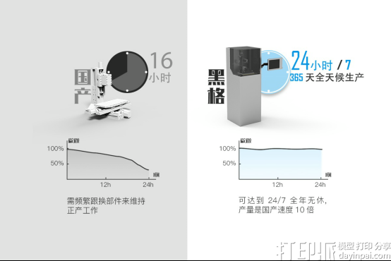 在生产制作过程中,3D打印的效率也非常影响产品的上市周期和铺货速度。黑格3D打印机的打印速度是传统3D打印机的3倍以上,同时可以7×24小时全年无休的正常运作,且保持高度的产品稳定性。反观传统3D打印机,连续工作16小时后,打印出的产品稳定性呈断崖式跌落。这意味着要完成同一批量的生产任务,传统3D打印机需要数倍于黑格3D打印机的数量才足以完成。