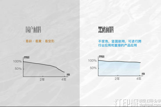 目前传统的3D打印材料无非是国产光敏树脂和进口树脂两种,其中国产光敏树脂易碎、易黄、易变形,无法应用到生物医学、个人消费等层面,因此适用面较窄。而进口树脂采购周期长,价格昂贵,平均价格甚至高达6000元/kg。鉴于市场上已有的材料均有缺陷,黑格与德国3D打印树脂制造商合作研发新型材料,将采购成本与制作成本压到最低,使新型材料的质量与进口树脂看齐的情况下,价格仅为其1/6。