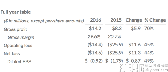 知名美国砂型3D打印公司ExOne近日发布了其2016年(截止2016年12月31日)财报,其中比较抢眼的数字是毛利润高达1420万美元(约合人民币9793万元),较2015年的830万美元猛增了72% — 该公司表示这主要是因为他们卖出了更多的大尺寸3D打印机。下面是这份财报的其它主要数字: