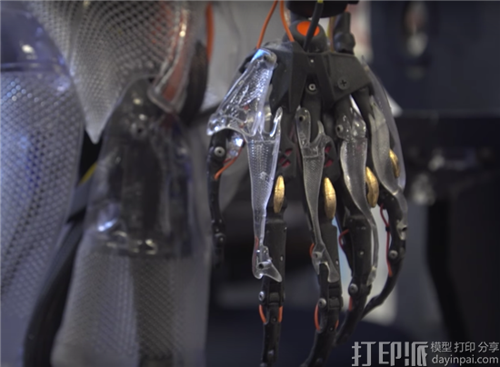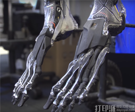 这个机器人骨骼包含300—400个单独的部件,每个都是用手工加工后组装而成。使用了不同的3D打印技术和材料,其中透明的树脂和黑色树脂使用了SLA,机器人的肺使用的是尼龙烧结SLS技术,关节和电枢使用了钢材质,保证了骨架的稳定性和耐久性。除了打印的部件,还有一些小模型组件、微型计算机螺丝和几十个激光切割的部件。其中3D打印花了长达数百个小时,后期的加工和组装也花了几个星期。