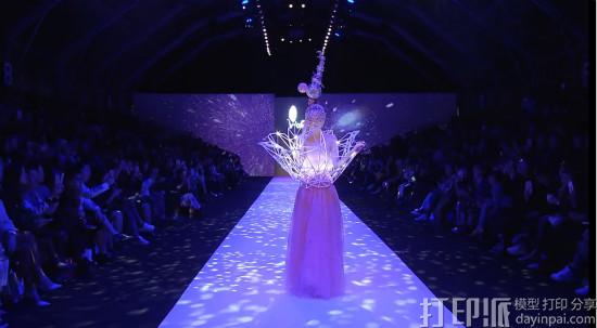 当模特徐徐走到舞台中央时,花瓣上突然亮起的点点闪光更是整个走秀的最大惊喜。这其实是设计师们在3D打印的尼龙材质上隐藏的小机关——LED灯带,这成为了本次走秀的画龙点睛之笔。