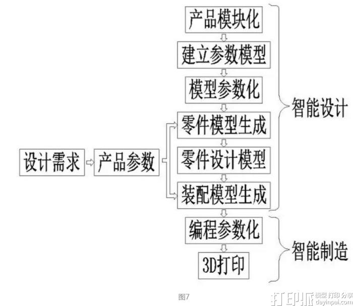 改变产品开发流程的前提是设计、制造实现智能化。目前基于产品模块化设计和参数化设计的方法可以实现智能化设计和智能制造,其基本流程如图7所示。产品模块化之后,在CAD软件应用参数化方法对模块化零件进行设计。模型尺寸不再用确定的数值表示,而是通过参数表示。之后将设计需求转化成产品参数,通过人机交互界面将产品参数转化成零件参数和装配参数,并导入到CAD软件,通过参数驱动生成零件模型和装配模型以实现智能设计[4]。进而通过参数化编程,并将模型参数传输到打印设备,从而最终实现智能制造。