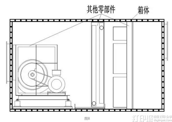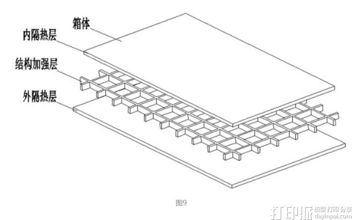 3D打印技术实现的整体成型空调箱体如图8,将箱体分为外隔热层、结构加强层、内隔热层如图9。外隔热层与内隔热层为独立的两个隔热层,外隔热层阻隔空调箱体外热能进入箱体内,内隔热层阻隔机组内热能传播到箱体外;结构加强层容置于外隔热层与内隔热层之间的间隙内,隔断外隔热层与内隔热层的热交换,同时起支撑和连接外隔热层和内隔热层的作用,还能够提高箱体强度。