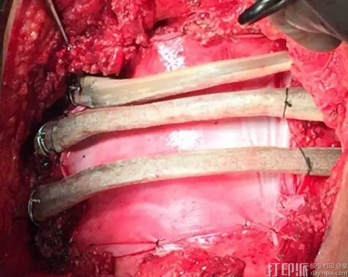 聚醚醚酮(PEEK)是目前国际上先进的高分子植入材料,具有非常良好的生物相容性,同时耐热等级高、耐辐射、耐化学腐蚀,抗冲击性能和抗疲劳性能好。因此,PEEK材料是非常理想的非金属植入物替代材料,国内仅西安交通大学等少数几家单位掌握了PEEK材料的3D打印技术。近期,在李小飞主任和曹铁生教授的指导下,胸腔外科黄立军副主任、王磊医生等积极开展了PEEK植入物的临床研究工作。该课题组联合西安交通大学李涤尘教授课题组展开了合作,首先委托我院3D打印中心的杨冠英副主任等构建了患者的3D打印胸廓模型,用于规划术前手术方案;之后联合西安交通大学贺健康、王玲教授等共同针对缺损的胸壁设计PEEK肋骨的模型,并进行有限元分析,在充分分析了PEEK肋骨的力学性能之后采用熔融沉积技术(FDM)进行打印。最终,黄立军副主任、钟代星和王磊医生等共同完成了手术,术中切除了左侧第2-5肋骨,胸壁缺损范围达20cm × 15cm,并顺利植入了3根PEEK肋骨进行胸壁重建。