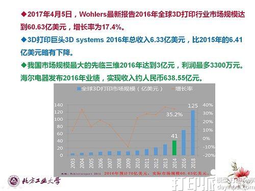 上图为2015年Wohlers公司发布的一个报告,它在2015年时,统计的2014年全球3D打印市场规模是41亿美元,当时的2014年也被称为3D打印元年,年增长率超过了35%。2014年的统计值是2015年发布的,2015年预测2016年的市场规模会达到70亿美元。根据2017年4月份Wholers发布的最新报告,2016年全球的3D打印市场规模达到了60.63亿美元,比预期的70亿美元略低。