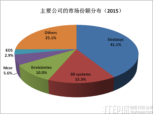上图为2015年全球主要的3D打印公司的市场份额分布情况,可以看出,美国的Stratasys占41.1%,3Dsystems占15%,德国的Envisiontec占10%,爱尔兰Mcor占5.6%,德国的EOS占2.9%,其余公司占25.1%。美国的Stratasys和3Dsystems占据了全球将近一半的市场份额,这是有历史原因的。其中3Dsystems公司成立于1986年,它是由发明家Charles·Hull创立的,是世界上第一家3D打印公司,其核心技术是SLA光固化成型技术。Stratasys是1988年由Scott·Crump创立的,其核心技术是FDM熔融沉积成型技术。