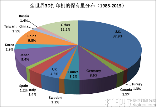 上图为全世界3D打印机的保有量分布,从1988年一直统计到2015年。可以看出,世界上3D打印机的保有量仍主要集中于美国,占了将近40%,中国大陆占9.5%,是发展中国家最高的,也基本上反映了我国3D打印在全球的位置。
