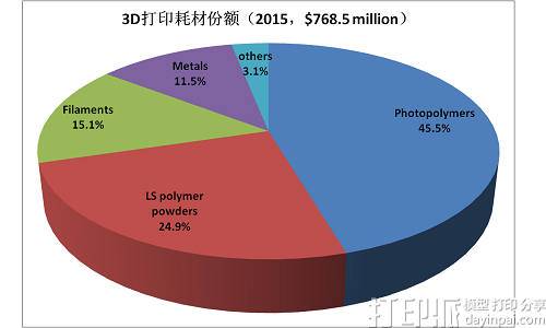 上图为3D打印耗材的份额,是截止到2015年的统计数据。可以看出,光敏树脂占比最高,占了45%;树脂粉末占了24.9%;消费级用到的纤维占了15.1%;金属粉末占了11%;其他材料占了3.1%。耗材的分布也反映了不同3D打印技术原理的市场分类情况。常见的FDM技术耗材占到了15%。金属粉末近几年在快速上涨。
