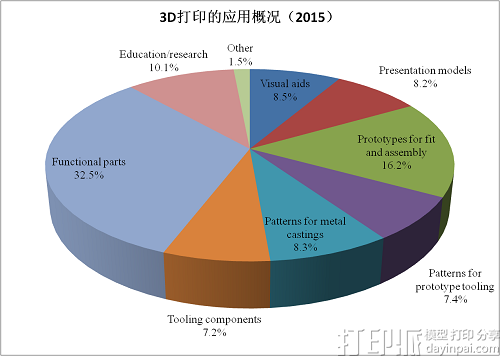 上图为3D打印的应用情况,可以看出,3D打印的30%用于功能性零件,具有一定的功能,其占比最高。用于配合设计的占16.2%,用于复杂的装配;可视化辅助占了8.5%,主要是设计师、工程师用于和客户间进行交流,包括医学上的辅助化治疗;教育研究占了10.1%,包括创客教育、一些科研实验。