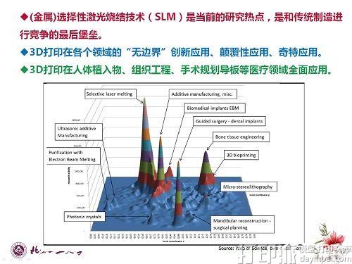 另外,从上图中可以看出,3D打印在一些医疗领域应用全面开花,包括3D生物打印、人体植入、组织工程、手术规划导板等都是当前的研究热点,可以说,3D打印在医疗医学领域全面开花,有一定的引领特征。