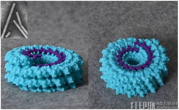 3D模型展示了烟草花叶病毒的部分结构,蓝色为病毒衣壳蛋白,紫色是遗传物质RNA,整体具有螺旋排列的规则结构,呈现长杆状。