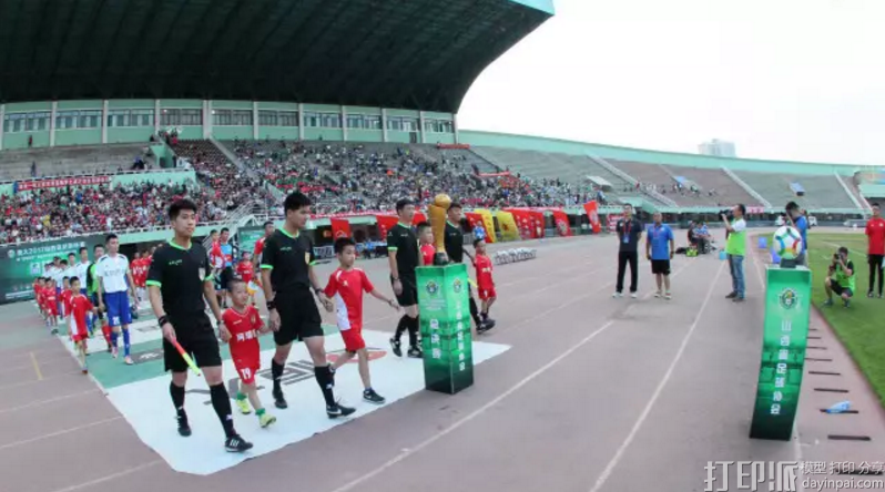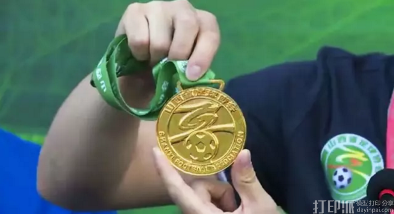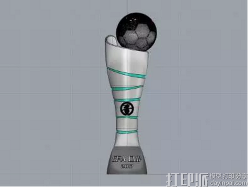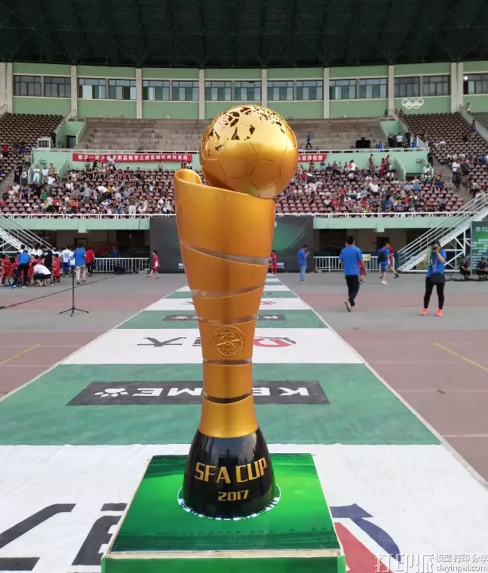奖杯分为上下两个部分,顶部的球为足球,下半部分为球场的演绎及变化,奖杯由3D打印而成,杯身高60cm,重量5KG。