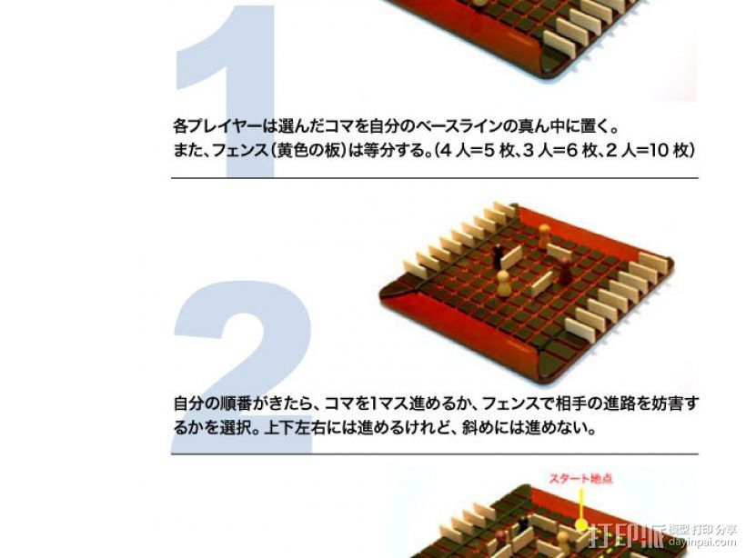 ---游戏开始,木人放在边路,开始向对岸行驶,谁最先到达对岸者为胜利者。如果玩家为3人或4人,一人胜利之后,其他玩家还可以继续争夺第二名、第三名。你可以在棋盘的任何方向行走,每次只能一步或者放挡板。放挡板的目的是阻挡对方到达对岸,如果选择放挡板的话,木人就不能走路,如果木人走一步,就不能放挡板。